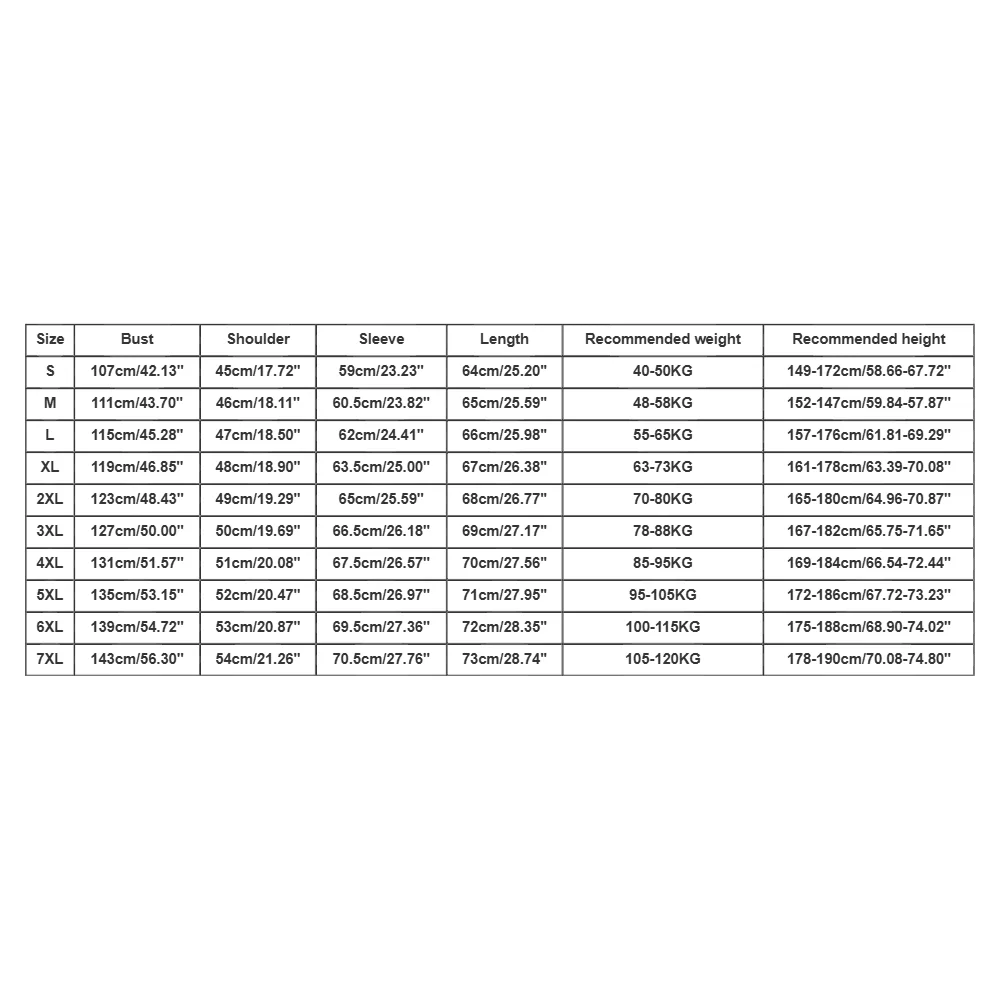 | Size:7XL | Bust:143cm/56.30'' | Shoulder:54cm/21.26'' | Sleeve:70.5cm/27.76'' | Length:73cm/28.74'' | Recommended weight:105-120KG | Recommended height:178-190cm/70.08-74.80'' |