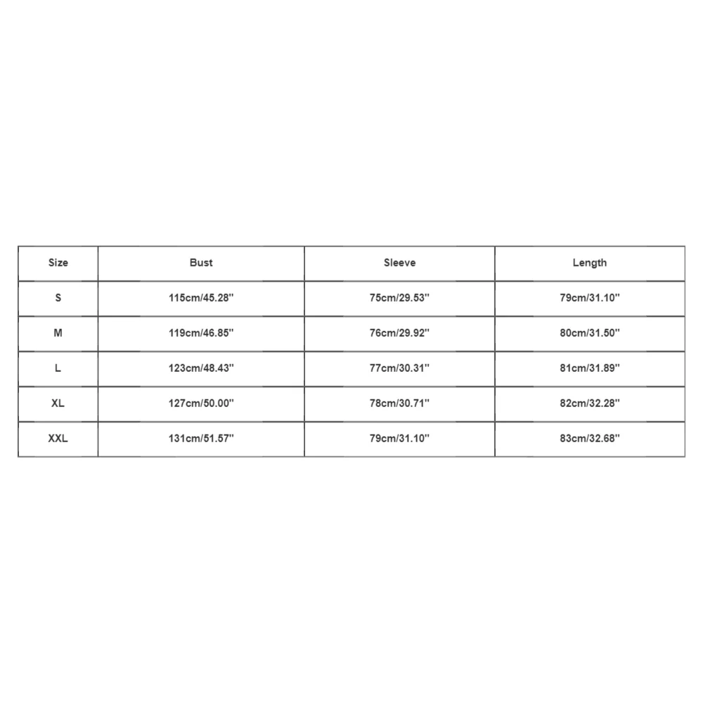 | Size:XXL | Bust:131cm/51.57'' | Sleeve:79cm/31.10'' | Length:83cm/32.68'' |