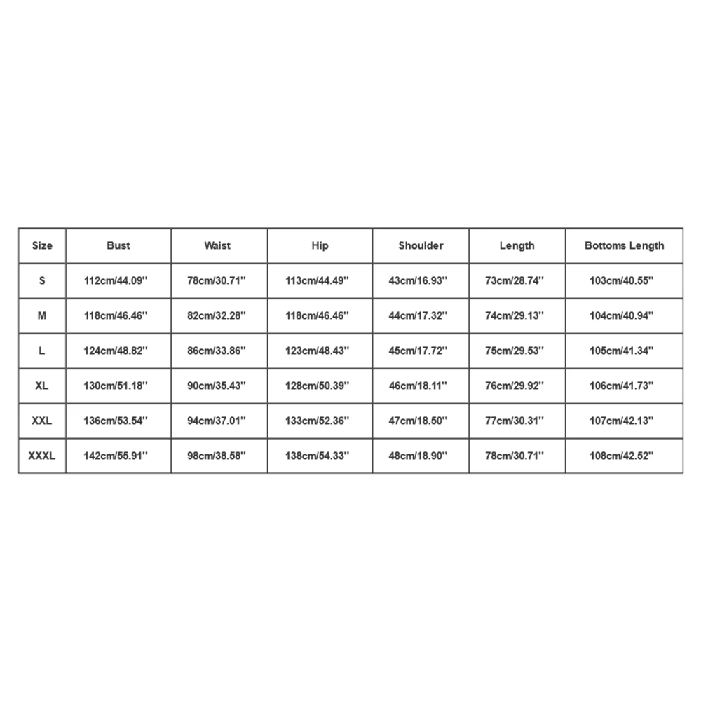 Size:XXXL | Bust:142cm/55.91'' | Waist:98cm/38.58'' | Hip:138cm/54.33'' | Shoulder:48cm/18.90'' | Length:78cm/30.71'' | Bottoms Length:108cm/42.52'' |