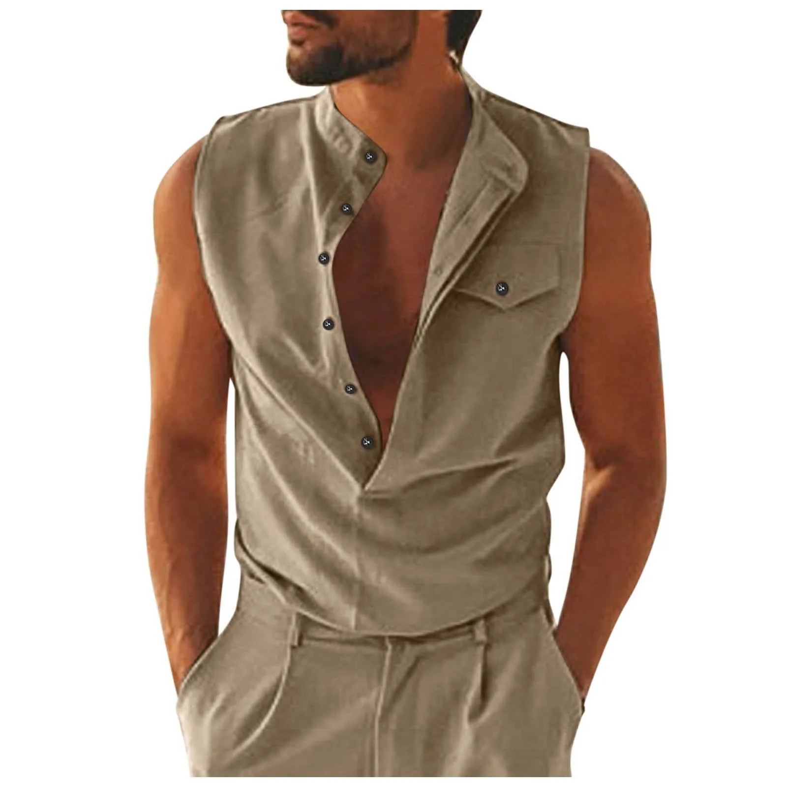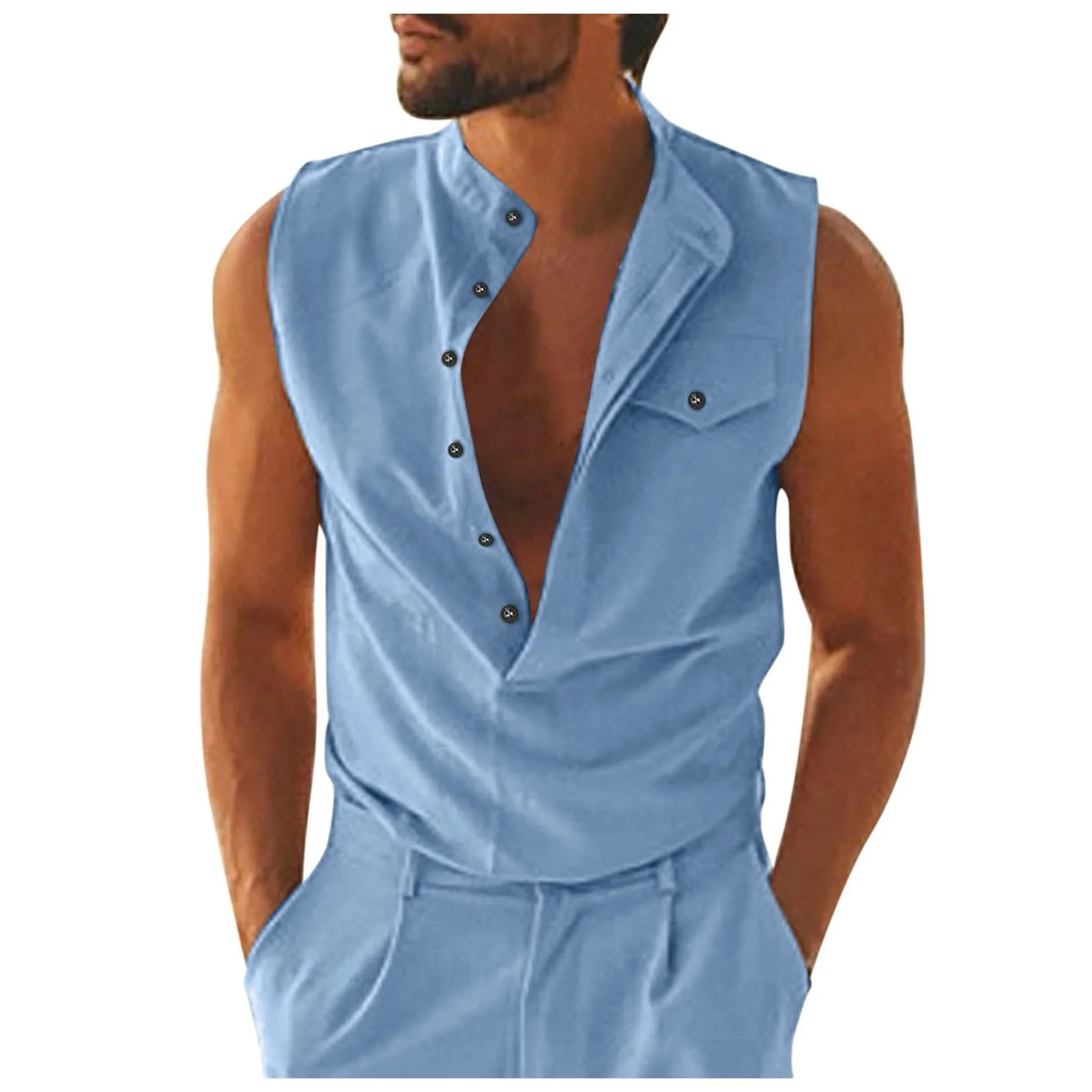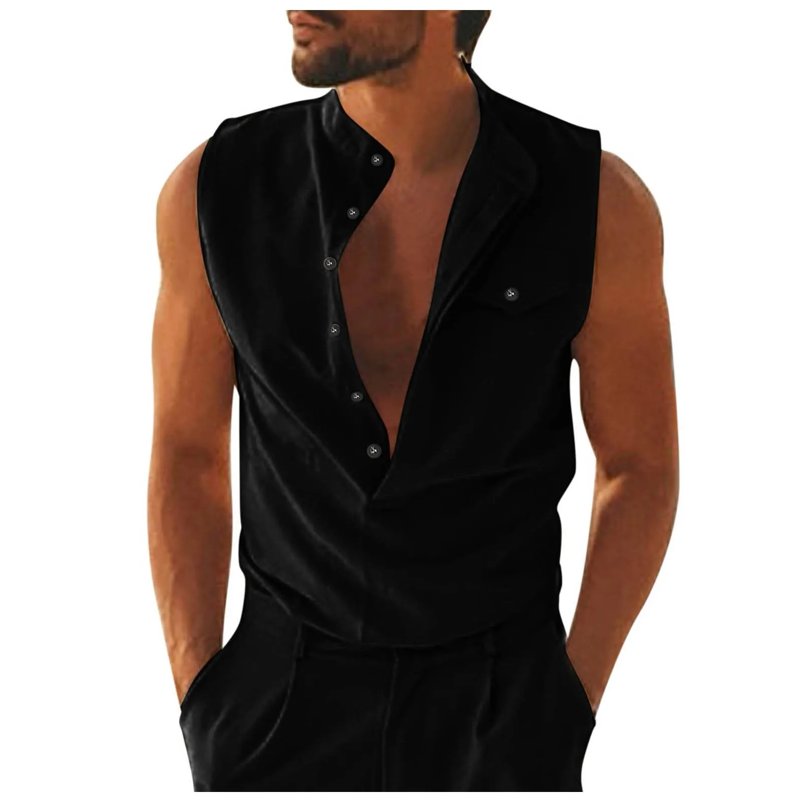 Men Summer Casual Button Down Round Neck Solid Tank Top Shirt With Pocket