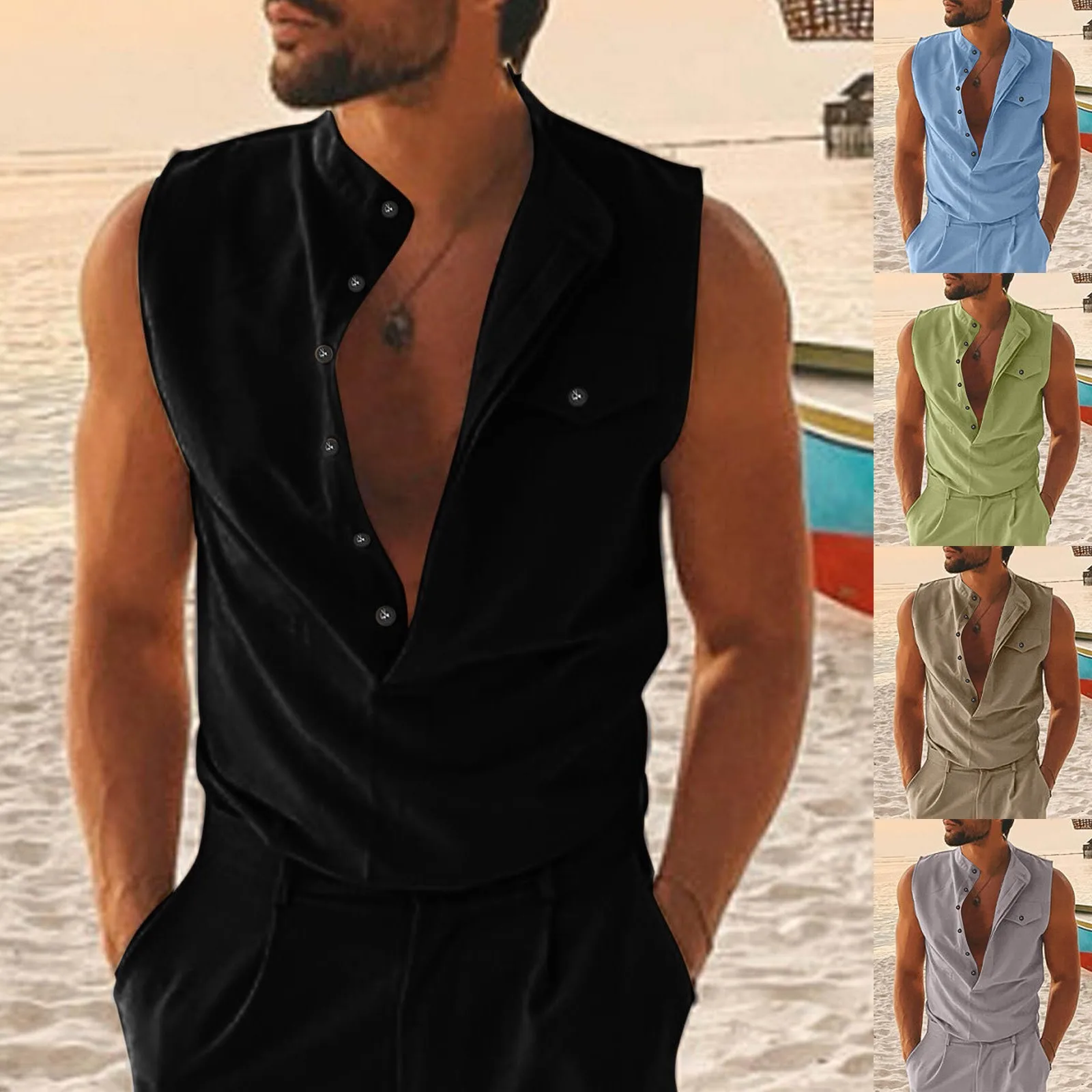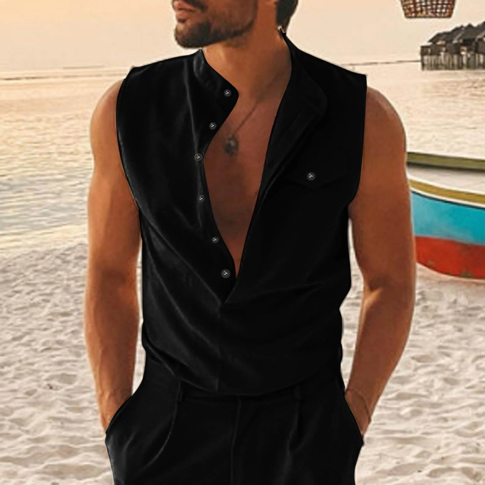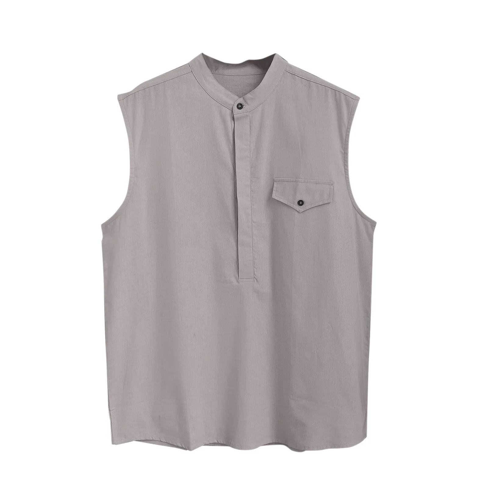 Men Summer Casual Button Down Round Neck Solid Tank Top Shirt With Pocket