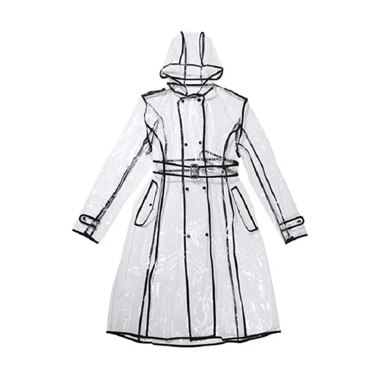 5. Make a statement with this Waterproof Transparent Plastic Clear Long Fashion Rain Coat. Featuring a hood and belt, this rainwear is perfect for adults looking for a stylish and practical option for staying dry in any weather.